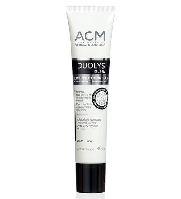 ACM DUOLYS RICHE SOIN HYDRATANT ANTI AGE 40ML L’hydratation de la peau est importante surtout pour le visage. Pour contrer le vieillissement prématuré, il est primordial de la nourrir. Le manque de soin se manifeste par une peau sèche, voire très sèche.