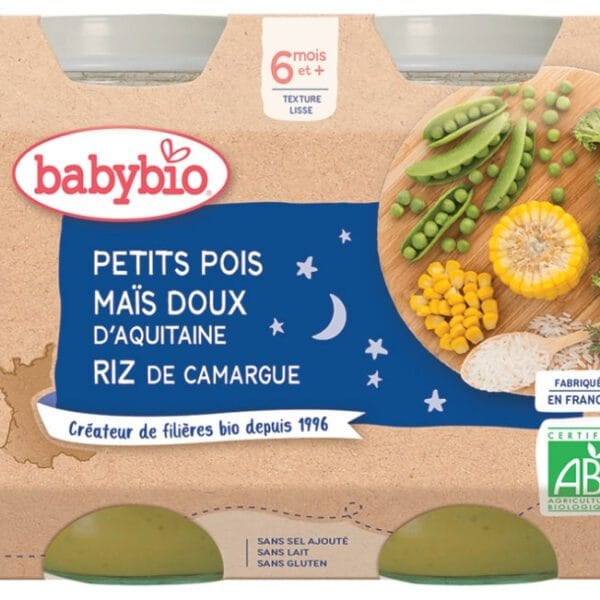 Babybio, Petit Pot Bonne Nuit : Petits Pois & Maïs Doux d’Aquitaine, Riz. Qui a dit que bébé n’avait pas droit aux grands plats ? Chez Babybio on pense aussi aux gastronomes en herbe.