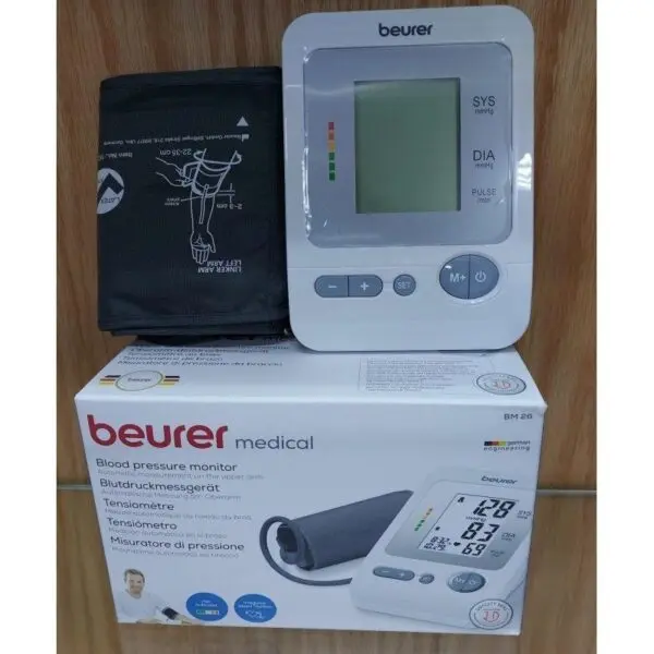 Mesure au niveau du brasEntièrement automatiqueGrand écran très lisibleClassification OMSLe tensiomètre Beurer BM 26 est, un appareil médical qui permet de mesurer la pression sanguine et le pouls au niveau du bras. Cet appareil de mesure reprend les fonctions que doit disposer un tensiomètre au bras, la prise en main est classique et ergonomique pour faciliter la prise de mesure. Le Beurer BM26 esrt entièrement automatique et avertit des éventuelles perturbations du rythme cardiaque. L’utilisation du tensiomètre électronique Beurer BM 26 est facile et rapide, les résultats obtenus sont fiables. Son écran permet de rendre plus lisible les données grâce à son affichage en grand chiffre, il montre l’heure et la date de la prise de mesure, indique le moment du changement des piles du tensiomètre et affiche la moyenne des 3 dernières valeurs de mesures effectuées. Le Beurer BM 26 s’arrête automatiquement si celui-ci n’est pas utilisé. L’appareil se compose de 4 profils d’enregistrement, ce qui peut être un plus. Ce produit médical, peut s’utiliser à domicile ou pendant vos déplacements grâce à son format transportable.Chez GirodMedical, nous vous livrons un tensiomètre au bras Beurer BM 26 d’une classification OMS accompagné d’une pochette de rangement, de 4 piles et d’un mode d’emploi pour simplifier son utilisation.Détails du Tensiomètre Beurer BM 26 ProduitBM 26Description du produitTensiomètre à brasType de mesureBrasEntièrement automatiqueouiClassement OMSouiDépistage de l’arythmieouiTaille de manchette en cm22 -36Fonction vocaleouiBranchement secteurouiIndicateur de changement des pilesouiArrêt automatiqueouiProduit médicaloui