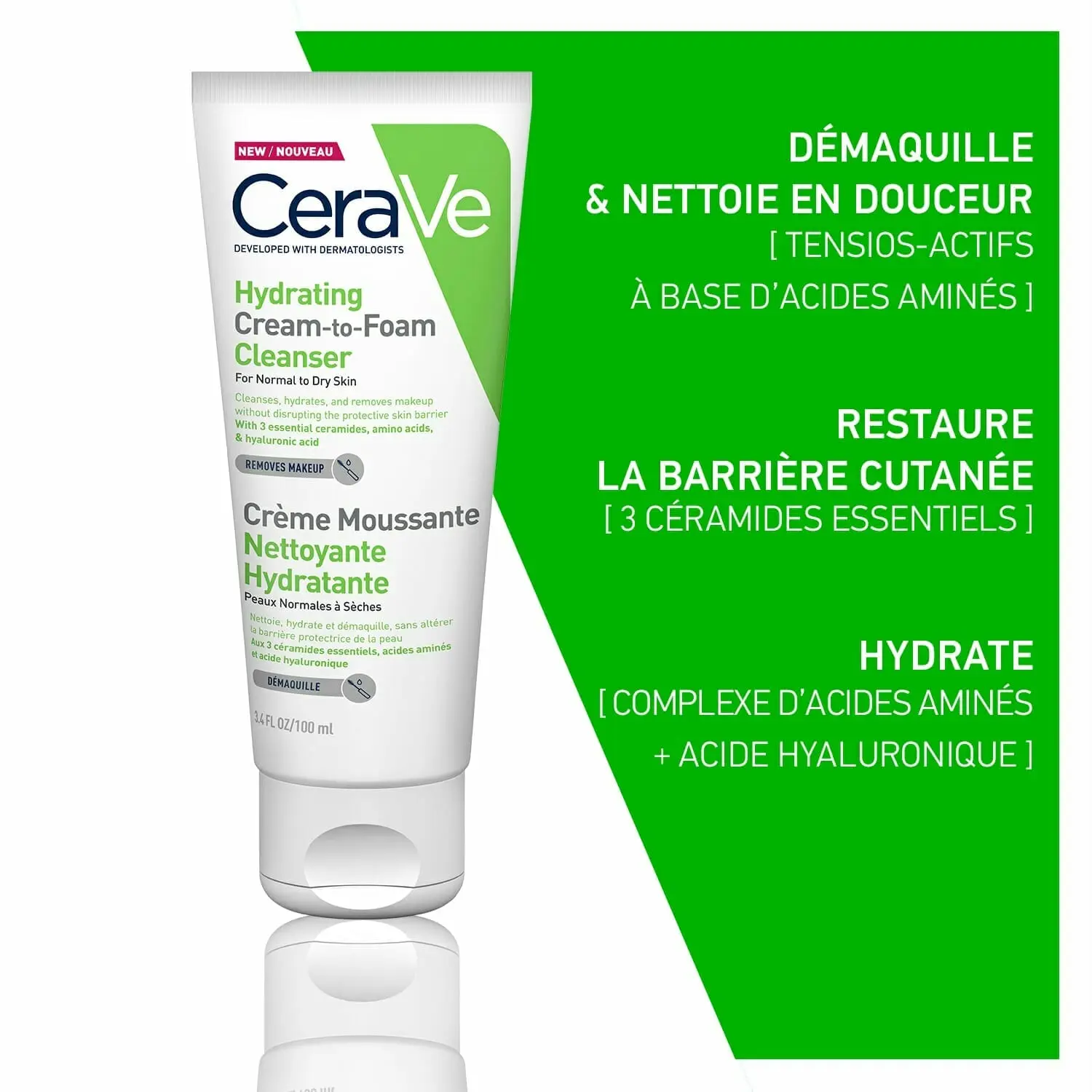 • Utilisation : Appliquer matin et soir sur peau humide. Visage. CERAVE CREME Moussante Nettoyante Hydratante Peau Normale à Sèche | 100m
