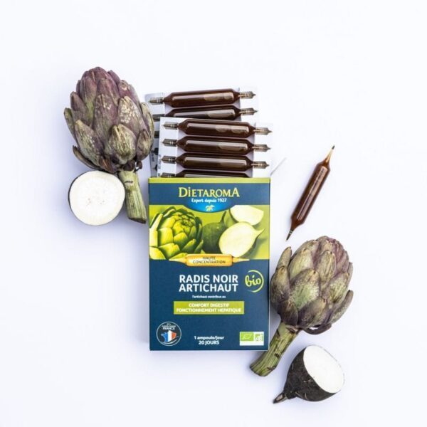 Digestion difficile, ballonnements, lourdeurs d’estomac ?Ayez le réflexe Diétaroma avec le Concentré Intégral de Plantes Artichaut Radis noir qui contribue au confort digestif.DescriptionDigestion difficile, ballonnements, lourdeurs d’estomac ?Ayez le réflexe Diétaroma avec le Concentré Intégral de Plantes Artichaut Radis noir qui contribue au confort digestif. La philosophie animant notre gamme Concentré Intégral de Plantes:1 – Expertise et innovation :Nous utilisons une méthode unique et innovante = la Blue Extraction .Il s’agit d’une nouvelle technologie d’extraction des plantes entièrement développée en France , permettant de recueillir le meilleur de la matière végétale sans utiliser de solvant.Grâce à elle, nous obtenons une plus grande variété d’actifs (totum de la plante), dans des concentrations plus importantes qu’avec les méthodes d’extraction classiques (infusion et décoction, macération…).2 – Traçabilité renforcée – filières locales et maîtrisées :Diétaroma s’engage avec un réseau d’agriculteurs pour vous proposer le meilleur des plantes dans une ampoule composée de plantes 100% bio , exclusivement issues de filières maitrisées et privilégiant l’ origine française quand cela est possible.20 ampoules de 10 ml – 1 ampoule/jour => 20 JoursVolume net : 200 mlFabrication françaiseConseils d’Utilisation :MODE D’EMPLOI : 1 ampoule par jour à diluer dans un grand verre d’eau.PRÉCAUTIONS D’EMPLOI :– Les personnes ayant une hypothyroïdie ou un traitement de la thyroïde doivent préalablement consulter un professionnel de santé. L’emploi chez la femme enceinte est déconseillé.– Agiter l’ampoule avant son ouverture.– Compte tenu du côté entièrement naturel du produit et de sa concentration très importante en plantes, un dépôt est possible. Il ne nuit en rien à la qualité du produit.– Ne pas dépasser la dose journalière recommandée.– Ne se substitue pas à un régime alimentaire équilibré et varié et à un mode de vie sain.– Tenir hors de portée des enfants.– Déconseillé en cas d’obstruction des voies biliairesComposition :INGRÉDIENTS : Extrait aqueux de feuille d’artichaut** (Cynara scolymus), jus de radis noir** (Raphanus sativus) et jus de sureau**** ingrédients issus de l’agriculture biologique.LA CONCENTRATION DIETAROMA – Apports par dose journalière recommandée:– Extrait Blue extraction d’artichaut 6,30 gDont : 2000 mg EPS (1)– Jus de Radis Noir : 3,20 g(1) Equivalent Plantes Sèches.