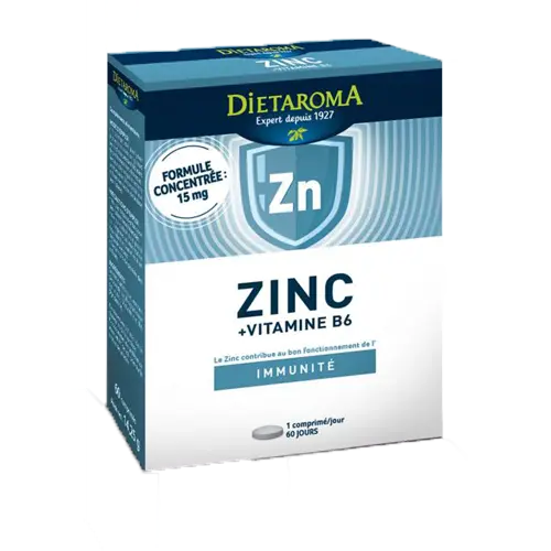 DIETAROMA ZINC VITAMINE B6 La formule concentrée en Zinc + Vitamine B6 de Dietaroma aide à booster les défenses immunitaires de l’organisme pour que votre corps puisse mieux résister aux changements de saisons et lutter contre les diverses affections telles que nez qui coule, rhume, refroidissement…