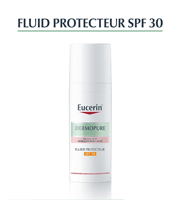 EUCERIN DermoPure Fluide Protecteur SPF 30 prèsente une très bonne tolérance cutanée et efficacité sur les peaux à imperfections avec marques post-acnéiques.