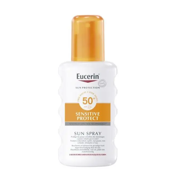Peaux normales à mixtes ou à tendance acnéique. Haute protection UVA/UVB conforme aux recommandations européennes. Protection biologique exclusive grâce à la licochalcone, un antioxydant naturel qui protège les cellules de la peau en profondeur contre les effets nocifs des rayonnements UV. Résiste à l’eau et à la sueur. Texture non grasse transparente qui ne laisse pas de résidus. Tolérance cutanée prouvée cliniquement, même sur peau à tendance acnéique.EUCERIN SUN PROTECTION SENSITIVE PROTECT SPRAY TRANSPARENT SPF 50 200MLDetails produits Eucerin Sun Spray Transparent SPF 50 200 ml Peaux normales à mixtes ou à tendance acnéique. Haute protection UVA/UVB conforme aux recommandations européennes. Protection biologique exclusive grâce à la licochalcone, un antioxydant naturel qui protège les cellules de la peau en profondeur contre les effets nocifs des rayonnements UV. Résiste à l’eau et à la sueur. Texture non grasse transparente qui ne laisse pas de résidus. Tolérance cutanée prouvée cliniquement, même sur peau à tendance acnéique. UTILISATION :Ne pas pulvériser sur le visage. Éviter le contact avec les yeux. Ne pas utiliser sur les enfants de moins de 3 ans. Appliquer généreusement et uniformément avant chaque exposition au soleil. Renouveler au moins toutes les 2 heures et après chaque bain. Éviter tout contact avec les vêtements afin de ne pas risquer de les tacher.