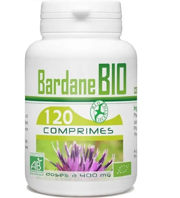 La bardane, une plante aux multiples qualités La bardane est une plante qui se démarque de différentes manières. Celle-ci provient de la famille des Astéracées. Elle est dotée d’un aspect très reconnaissable. De petits crochets, qui se situent sur ses capitules, ont une tendance très fréquente à s’accrocher facilement. On retrouve ainsi des morceaux de bardane sur ses vêtements lorsqu’on la croise, mais aussi sur le pelage des animaux, après une promenade en nature dans un champ où la bardane est représentée. C’est une première spécificité intéressante. L’aspect esthétique de la bardane La bardane a également une couleur très particulière. Elle est dotée de fleurs à la teinte fuchsia, très belle à l’oeil, et la forme de la fleur elle-même est plutôt spécifique. Elle fait penser à celle du chardon-marie, avec ses pétales ressemblant à de petites épines, de par leur forme pointue. Les fleurs de la bardane sont donc tels de petits oursins violets. On consomme la bardane au Japon en tant qu’aliment. Dans ce pays asiatique, on lui donne le nom de gobo, et on la déguste comme un légume. Pourquoi utiliser la bardane ? La bardane est donc non seulement une plante ornementale très esthétique, mais aussi un végétal très prisé dans le monde de la phytothérapie. Parmi ses différents principes actifs, la bardane contient de l’inuline, une substance qui se trouve tout aussi bien dans ses racines que dans ses fruits. Parmi les utilisations que l’on peut faire de cette plante, celle-ci peut être absorbée par le biais de gélules comme c’est le cas ici, mais elle est également souvent employée en usage externe. CONSEIL D’UTILISATION : 2 à 3 comprimés par jour, avec un grand verre d’eau et dans le cadre d’une alimentation équilibrée. Tenir hors de portée des enfants. Ne pas dépasser la dose journalière recommandée. INGRÉDIENTS : Pour une prise journalière de 3 comprimés de Bardane Bio : Poude de bardane racine* : 1200mg Carbonate de magnesium, talc * Produit issu de l’agriculture biologique