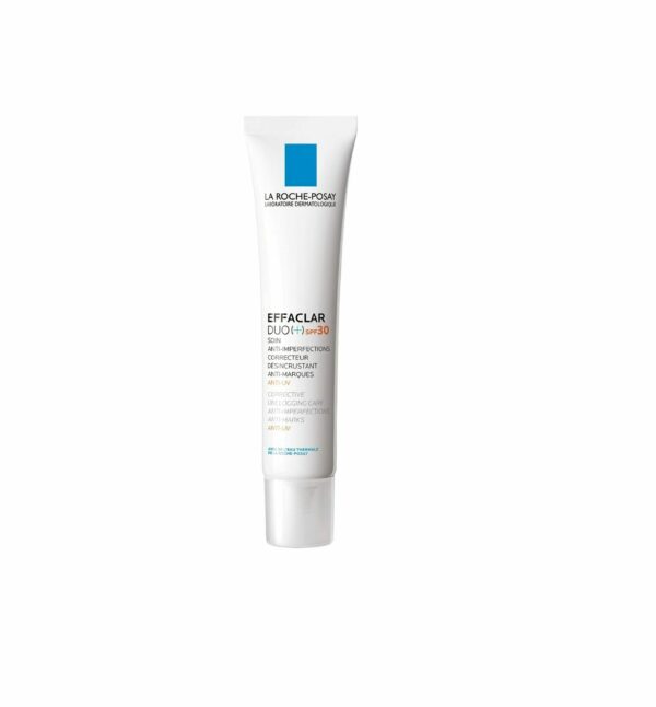 Exposées aux UV quotidens, les imperfections s’aggravent et présentent un risque d’hyperpigmentation (marques rouges ou brunes).EFFACLAR Duo(+) SPF 30 protège la peau des UV grâce à une haute protection SPF30, pour une action renforcée contre les marques. Les imperfections sont significativement réduites.Les pores sont désobstrués, le grain de peau est affiné, les brillances sont régulées.Description : LA ROCHE POSAY EFFACLAR DUO+ SOIN ANTI-IMPERFECTIONS SPF30 PEAU GRASSE ACNEIQUE | 40MLLA ROCHE POSAY EFFACLAR DUO+ SOIN ANTI-IMPERFECTIONS SPF30Caractéristiques :Contrairement à ce que l’on pourrait croire, une peau grasse est également une peau très sensible.Pour en prendre soin, il est indispensable d’utiliser des produits spécifiques qui agissent sur les imperfections et régulent la production de sébum sans pour autant irriter l’épiderme.C’est le cas du soin Effaclar Duo+ SPF30 qui traite la peau grasse à tendance acnéique grâce à un complexe d’actifs puissants justement dosés.Son action est multiple :– Réduit les imperfections– Corrige le teint– Désincruste les pores– Prévient l’apparition des marques et des taches– Protège des rayons UV grâce à son SPF30Sécurité :– Hypoallergénique.– Sans bène.– Convient aux peaux sensibles. Ingrédients & Principes Actifs Clés :– Procérad : ce céramide breveté est un anti-marques exclusif. Il– Niacinamide : qui apaise durablement la peau. Anti-rougeurs.– LHA & Acide Salicylique : micro-exfolie pour une action anti-irritations.– Zinc PCA : réduit l’excès de sébum.– Filtre anti-UV XL Protect : ce filtre solaire forme une barrière de protection pour limiter la pénétration des rayons UVA/UVB. Conseils d’Utilisation :Appliquez chaque matin sur l’ensemble du visage sur la peau parfaitement nettoyée avec EFFACLAR Gel Moussant.Excellente base de maquillage. Evitez le contour de l’œil.Ce produit n’est pas un produit solaire. En cas d’exposition prolongée ou intense au soleil, appliquez une crème solaire et renouvelez l’application régulièrement. Efficacité :Après 8 jours d’utilisation, 81% des femmes estiment que leur peau est purifiée et après 4 semaines, 89% trouvent que leur peau semble plus lisse et 80% trouvent que la texture de leur peau est affinée.**Protocole : 54 volontaires caucasiennes, entre 18 et 40 ans, ayant une peau grasse à tendance acnéique. 4 semaines – une fois par jour – visage, questionnaire d’auto-évaluation.