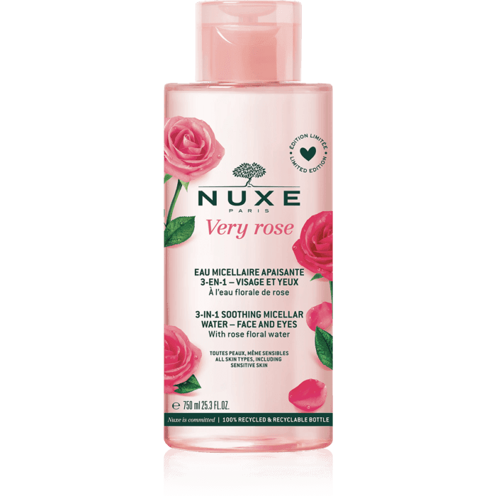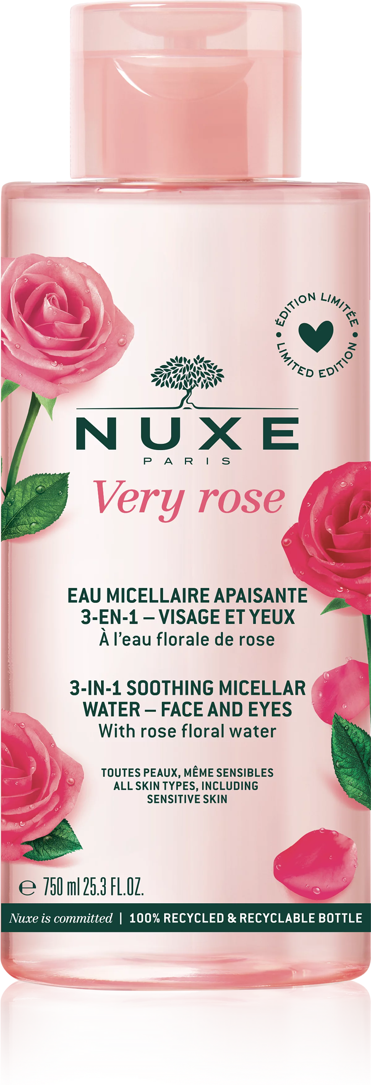 Eau micellaire apaisante NUXE Very Rose 3-en-1 en format 750ML. Nettoie, démaquille et apaise toutes les peaux, même sensibles.