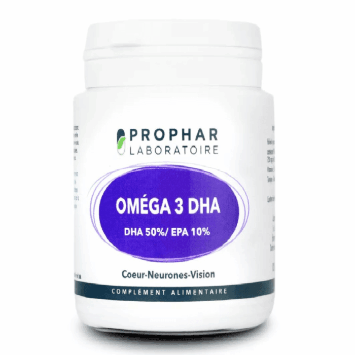 Retrouvez ces acides gras dans ce complément alimentaire OMEGA 3 de Prophar. Sa teneur en omega 3 dans une capsule est optimale : 50% de DHA et 10% de EPA.