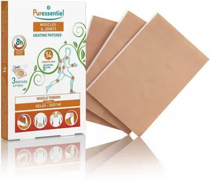 Ces patchs chauffants et adhésifs aident à soulager les zones sensibles et les tensions musculaires. Leur formule associant 14 huiles essentielles et du Capsicum, procure une sensation agréable et durable de chaleur pendant 8 heures, qui favorise la décontraction du muscle. Ce patch chauffant sans odeur et souple est invisible sous les vêtements et s’adapte à tous les mouvements. Il se découpe à la dimension voulue et s’applique directement sur toutes les zones sensibles du corps (dos, genou, nuque, épaule, coude, poignet, cuisse, mollet,…).nnProduit issu de l’aromathérapie – Sans conservateur – Sans parfum de synthèse – Sans colle synthétiquenn3 patchs – Dimensions 160 x 110 mmnnConseilsnComment utiliser les Patchs Chauffants PURE HEAT® ?nnCe patch chauffant doit être appliqué sur une peau saine, sèche et non grasse. Il ne doit pas être appliqué sur les peaux sensibles, le visage, les plaies, les muqueuses, la peau irritée, en particulier après une épilation ou un rasage. Evitez d’appliquer ce patch chauffant sur des zones corporelles qui risquent d’être comprimées (vêtement serré, pli intérieur du coude, genou…).nnPour apaiser les tensions des zones articulaires et musculaires, découvrez notre huile de bain.nnCe patch chauffant est déconseillé aux enfants de moins de 15 ans, aux femmes enceintes ou allaitant, aux personnes ayant des antécédents de troubles convulsifs ou épileptiques. Ne pas utiliser en cas d’allergie aux salicylés ou à l’un des composants. Tenir hors de portée des enfants. Le patch procure une sensation de chaleur d’intensité et durée variable en fonction de la réactivité propre à chacun et peut provoquer une rougeur cutanée locale normale. En cas de sensation de brûlure, d’irritation cutanée ou d’allergie, retirer immédiatement le patch. Ne pas porter plus de 8 heures. Ce produit est un cosmétique à usage externe.nnPURESSENTIEL ARTICULATION & MUSCLE PATCHS CHAUFFANTS 14 HE X 3U