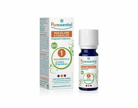 La senteur de l’huile essentielle de marjolaine se rapproche celle du thym.nLa marjolaine à coquilles, ou « marjolaine des jardins », est originaire de l’est du bassin méditerranéen (Chypre, Egypte, Turquie), elle supporte les terrains arides et est cultivée jusqu’à 2000 mètres d’altitude.Conseils d’utilisationnnPrendre au maximum 2 gouttes d’huile essentielle de marjolaine à coquille 3 fois par jour sur un comprimé neutre Puressentiel (ou 1 cuillère à café de miel, d’huile d’olive, ou 1/4 de sucre).nNe pas utiliser l’huile essentielle de marjolaine à coquille pure sans support, ni mélangée à l’eau. Pour d’autres conseils d’utilisation, demandez conseil à votre pharmacien.nÉquivalence : 1ml -> 31 gouttesnnCompositionnIngrédients : Huile Essentielle de Origanum majorana*. Chémotype : terpinène-4-ol, γ-terpinène.nnTenir hors de portée des enfants. Complément alimentaire. L’huile essentielle de marjolaine à coquille ne se substitue pas à une alimentation variée et équilibrée et à un mode de vie sain.nRespecter les doses recommandées. Par mesure de précaution, ne pas utiliser chez les enfants de moins de 7 ans, les femmes enceintes ou allaitant.nConserver l’huile essentielle de marjolaine à coquille à l’abri de la lumière, de l’air et de la chaleur.