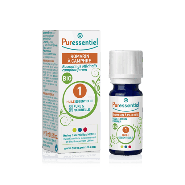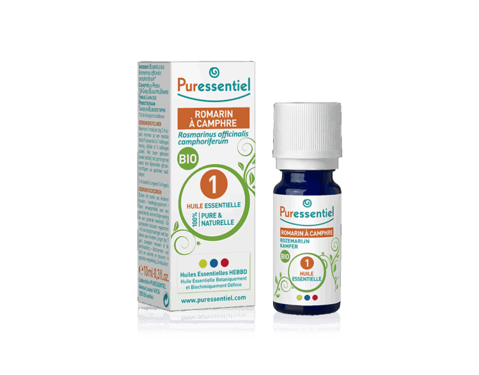 Fraîche et épicée, l’odeur de l’huile essentielle de romarin à camphre est fine.nLe romarin à camphre peut mesurer jusqu’à 2 mètres de haut et fait partie des fameuses « herbes de Provence ».nCet arbrisseau est l’une des plantes aromatiques les plus cultivées en France, et se plaît dans les garrigues et les maquis.nn nnLABORATOIRE PURESSENTIELnAvenue Louise 149/24n1050 BruxellesnBELGIQUEnnConseils d’utilisationnPrendre au maximum 2 gouttes l’huile essentielle de romain à camphre 3 fois par jour sur un comprimé neutre Puressentiel (ou 1 cuillère à café de miel, d’huile d’olive, ou 1/4 de sucre).nNe pas utiliser l’huile essentielle de romarin à camphre pure sans support, ni mélangée à l’eau.nPour d’autres conseils d’utilisation, demandez conseil à votre pharmacien.nnCompositionnIngrédients : Rosmarinus officinalis camphoriferum* chémotype : α-pinène, 1-8 cinéole (eucalyptol), camphre.nnTenir hors de portée des enfants. Complément alimentaire. L’huile essentielle de romarin à camphre ne se substitue pas à une alimentation variée et équilibrée et à un mode de vie sain.nRespecter les doses recommandées. Par mesure de précaution, ne pas utiliser chez les enfants de moins de 7 ans, les femmes enceintes ou allaitant.nConserver l’huile essentielle de romarin à camphre à l’abri de la lumière, de l’air et de la chaleur.
