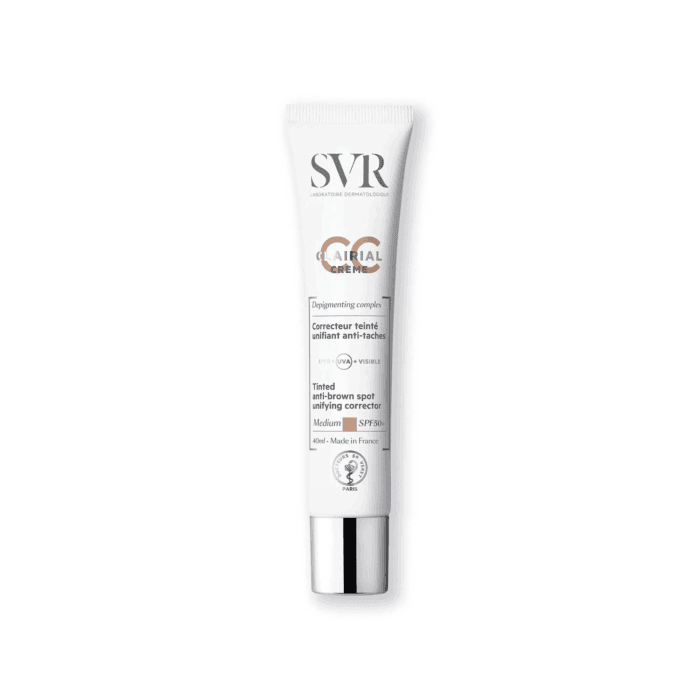 SVR CLAIRIAL CC CREME MEDIUM SPF 50+ 40ML Pour tous les types de taches brunes liées au soleil, au vieillissement, aux marques d’imperfections. Peaux sensibles. Adultes. Visage & cou.