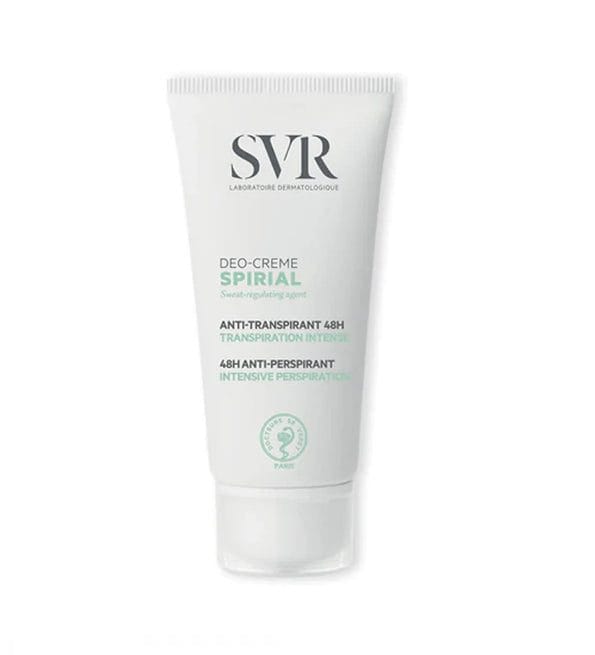 Déodorant anti-transpirant intense 48H**Test scientifiqueCaractéristiques SVR SPIRIAL CREME 50 ML:SVR SPIRIAL CREME 50 ML est disponible dans votre en ligne .Toutes les peaux même les plus sensibles. Transpiration normale à excessive. Enfant de plus de 3 ans (sur avis médical), adolescent, adulte. Aisselles, pieds, mains, plis ou visage.Déodorant soin multi-zones à l’efficacité anti-transpirante intense 48H* même en situations extrêmes (sport, stress…). Formulé avec une haute concentration en agents sudo-régulateurs, il régule la transpiration, absorbe l’humidité et lutte contre les mauvaises odeurs dans la plus haute tolérance. Sa texture crème non grasse et non collante laisse la peau douce et confortable.Des Tests scientifiques ont été faits sur des VOLONTAIRES CONVAINCUS(1) :Toutes les personnes qui ont testés le produits confirme qu’il n’irrite pas la peau• 95% : prévient la formation de mauvaises odeurs corporelles• 80% : réduit la transpiration excessive(1)Test d’usage 21 jours, 21 volontaires, % de satisfaction.Composition :Une charte de formulation stricte adaptée aux peaux sensibles.Testé sous contrôle dermatologique. Hypoallergénique.HAUTE CONCENTRATION EN ACTIFS SUDO-REGULATEURS POUR UNE ACTION ANTI-TRANSPIRANTE INTENSE 48H* :Chlorohydrate d’aluminium :• La forme la plus tolérée des sels d’aluminium pour réguler durablement la transpiration et absorber l’humidité.Microsphères absorbantes :• Absorbe l’humidité.*Test scientifiqueConseils d’utilisation :Appliquer au quotidien sur peau propre et sèche.