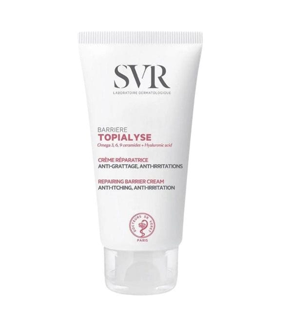 TOPIALYSE BARRIERECrème rétrice anti-grattage, anti-irritations.Caractéristiques SVR TOPIALYSE CREME BARRIÈRE 50ML:SVR TOPIALYSE CREME BARRIÈRE 50ML est disponible dans votre en ligne .Pour les peaux sèches à tendance atopique.Zones réactives, irritées et localisées: mains, visage, corps.Enfants et adultes.TOPIALYSE BARRIERE comme son nom l’indique protège la peau contre les agressions quotidiennes (stress, tâches manuelles et ménagères…). Il apaise immédiatement les sensations de grattage et limite leur réapparition, accélère la rétion de la peau et forme un film barrière pour la protéger.Le tout dans une texture nourrissante au fini invisible, non gras et non collant.Résiste à l’eau.COMMENT CA MARCHE ?Une formule triple action haute tolérance qui répare, restaure et protège les zones réactives et irritées.– Action anti-grattage :• Omegas 3, 6, et 9 : Restaurent, restructurent et renforcent la fonction barrière– Peptide régulateur : Régule les mécanismes de défense naturelle• Acide glycyrrhizique : Apaise les sensations de grattage– Action rétrice Acide hyaluronique de haut poids moléculaire : effet barrière protecteur• Complexe huile de Crambe + phytostérols : protège sans effet occlusifConseils d’utilisation :Utiliser quotidiennement sur les zones localisées irritées (mains, visage, corps, plis) et à chaque fois que le besoin s’en fait sentir.Appliquer le matin pour une protection tout au long de la journée et le soir pour une action rétrice optimisée.