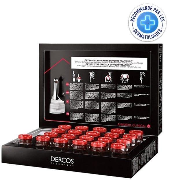 DERCOS TECHNIQUE Aminexil Clinical Hommes traite et stoppe la chute de cheveux chez l’homme.nn• Besoin : Chute de cheveux | Hommes.n• Ingrédients Clés : Aminexil pour gainer les tissus capillaires | Arginine pour améliorer la circulation au niveau des racines | SP94 pour densifier.n• Sécurité : Hypoallergénique | Testé sur cuir chevelu sensible.n• Utilisation : Appliquer 1 ampoule par jour pendant 6 semaines en cure intensive. En cure d’entretien, appliquer 3 ampoules par semaine. Ne pas rincer.nnVICHY DERCOS AMINEXIL CLINICAL 5*21 HOMME